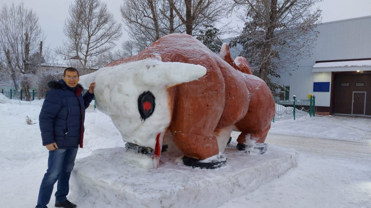 Высота снежного быка составляет почти три метра. Автор творения - 27-летний сержант Алишер Куттыгали. Он работал над изготовлением фигуры две недели.