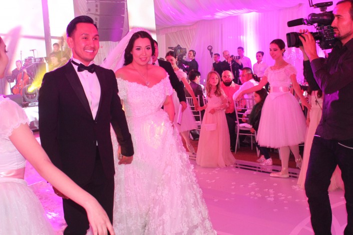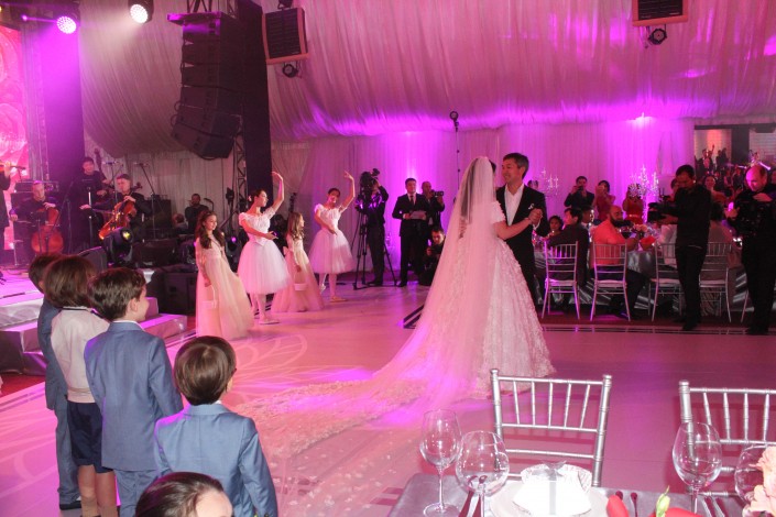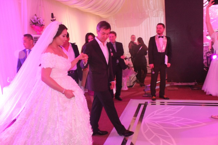 Уже на большое торжество невеста поменяла наряд на платье с длинным шлейфом и фатой. К мужу ее вел под руку отец - бизнесмен Раимбек Баталов.