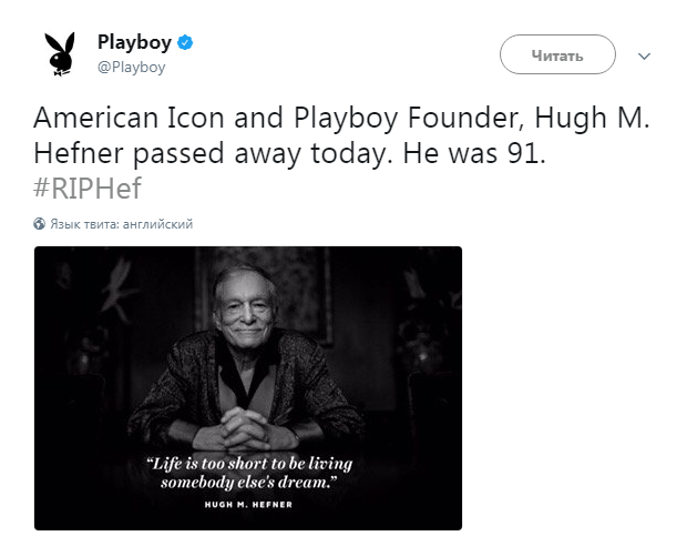 "Американская икона и основатель Playboy Хью М. Хефнер ушел из жизни. Ему был 91 год", - говорится в тексте.