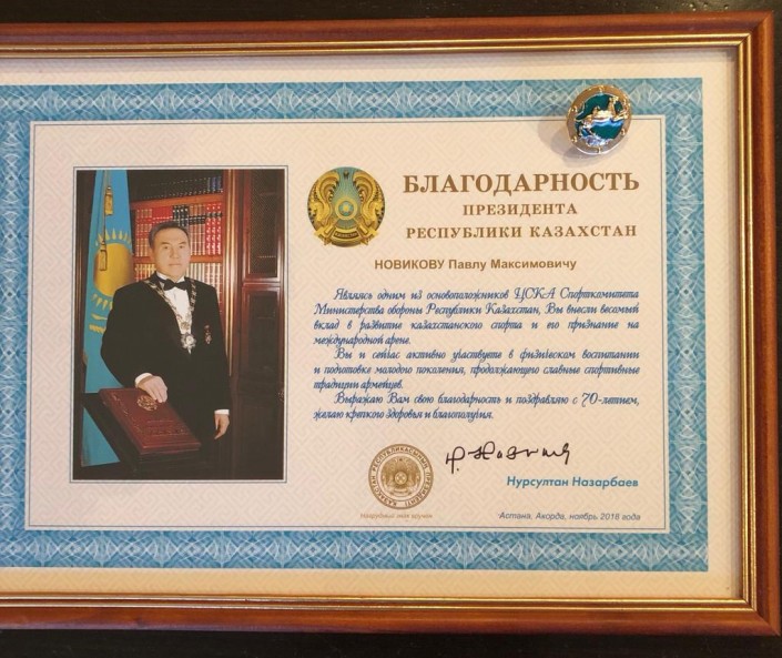 В этом году по решению оргкомитета Евразийского проекта "Алтын-Адам- Человек года" в Казахстане генерал-майор Павел Новиков признан лауреатом в номинации "Вклад в достижения и развитие спорта".