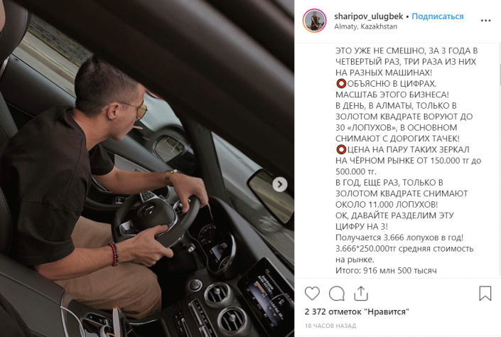 Ранее бизнесмен Улугбек Шарипов на своей странице в Instagram заявил, что неизвестные похитили зеркала с его автомобиля