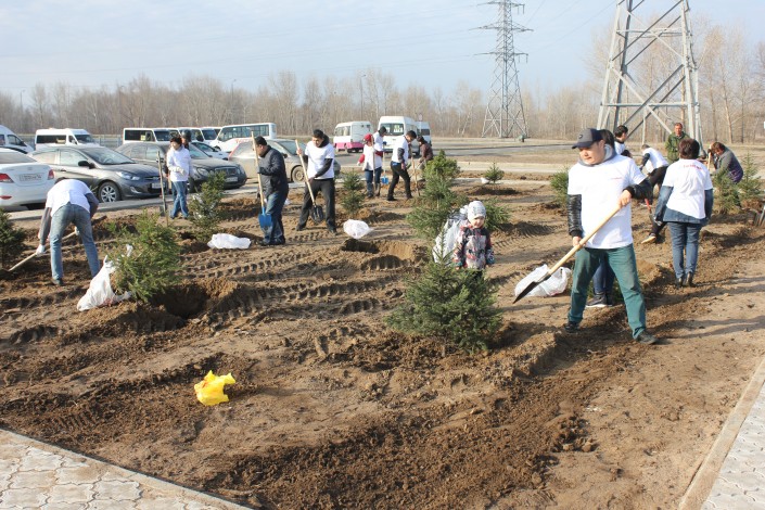 Озеленить территорию павлодарского бассейна банкиры пришли вместе со своими семьями. Прежде чем перейти к посадочным работам, сотрудники очистили территорию от мусора, подготовили почву и пригласили специалистов-озеленителей, чтобы соблюсти технологию посадки.