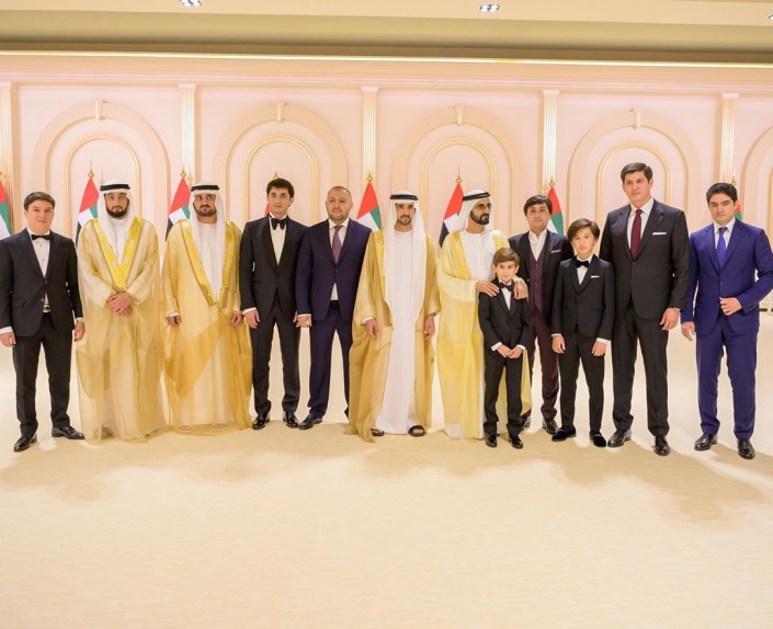 На фотографии видно, как эмир Дубая стоит, положив руки на плечи сына Мирзиеева, а зятья главы Узбекистана стоят в одном ряду с одним из женихов.