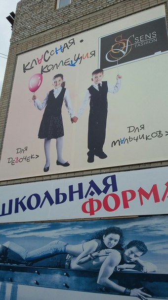 Как отмечает телеканал, магазин, на стене которого разместили баннер, действительно продает школьную форму. Но чтобы увидеть на баннере скромно одетых мальчика и девочку, а не расположенную внизу парочку, нужно отойти на значительное расстояние.