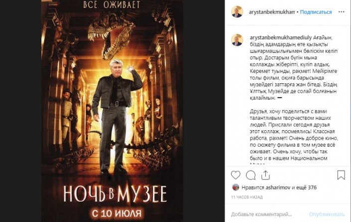 "Ағайын, біздің адамдардың өте қызықты шығармашылығымен бөліскім келіп отыр. Достарым бүгін мына коллажды жіберіпті, күліп алдық. Керемет туынды, рақмет! Мейірімге толы фильм, оқиға барысында музейдегі заттарға жан бітеді. Біздің Ұлттық Музейде де солай болғанын қалаймын", - деп жазды ол Instagram желісінде.