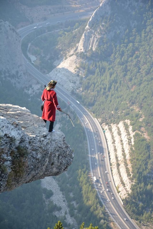 "Осы тұста айтқым келетіні, бұл ешқандай да фотошоп емес. Мына суретте мен тұрған жардың асты бос секілді, негізі бұл таудың етегіне жалғасқан, тек мен түскені жері сәл шығыңқы. Суретке түскенде астындағы екінші жар көрінбей қалған. Қайтсе де адам сескенбей бара алатын жер емес, аяқ тайып кетсе шатақ, құдай сақтасын. Аяқ киімімді шешіп барып қана жар шетіне жақындадым", - дейді ол.