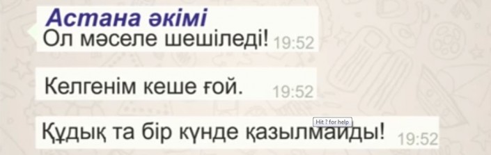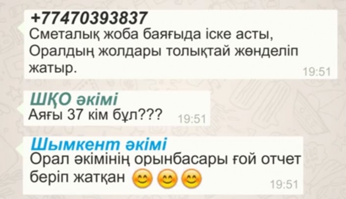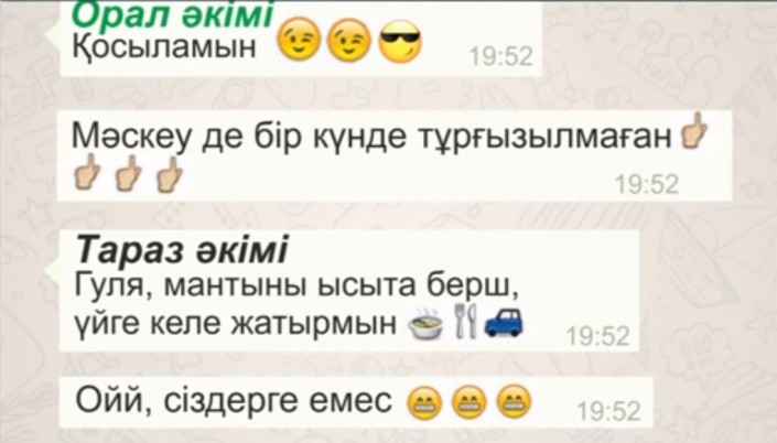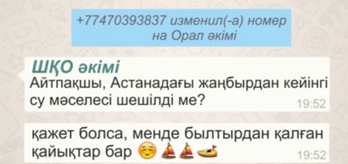 Из шуточного ролика с перепиской по WhatsApp акимов Казахстана автор удалил фрагмент с фразами акимов Восточно-Казахстанской области, Уральска, Астаны и Тараза. Первоначальная версия, опубликованная в YouTube в воскресенье, была длительностью около 2,5 минуты. Урезанная содержит всего лишь 1,46 минуты.