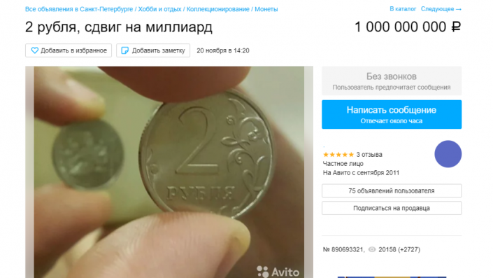 Россиянин выставил на продажу монету за миллиард рублей © Avito.ru