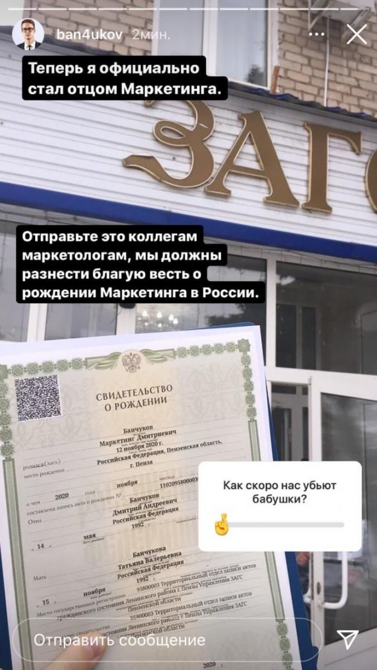 "У нас родился первенец. Мы с супругой решили назвать его Маркетинг. Теперь я официально стал отцом Маркетинга", - написал мужчина в социальной сети "ВКонтакте".