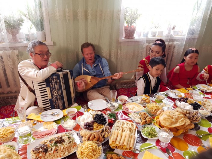 Глава семьи Сетимхан Аймаханов рассказал Джону Уоррену о казахских семейных традициях, о национальных инструментах. После вся семья исполнила для гостя песню.