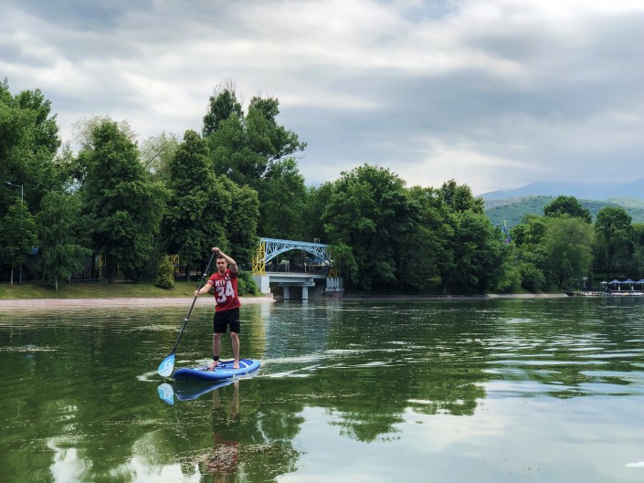 "Суть SUP-серфинга в том, что ты стоишь на ногах или коленках на доске и передвигаешься с помощью весел. В мае мы начали искать подходящие места, остановились на озере Сайран. Пробовали также кататься на озере в парке, но там вода очень грязная и неприятно пахнет. Если в нее нечаянно упадешь, то будет неприятно. Да и руководство парка против SUP-серфинга, потому что ничего о нем не знает", - рассказывает мужчина.