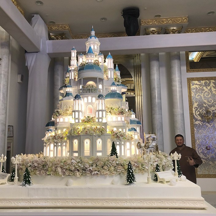 Автором кулинарного шедевра стал известный российский кондитер Ренат Агзамов. Диаметр торта 3 метра, высота - 4,2. Вес - около 1 500 килограммов.