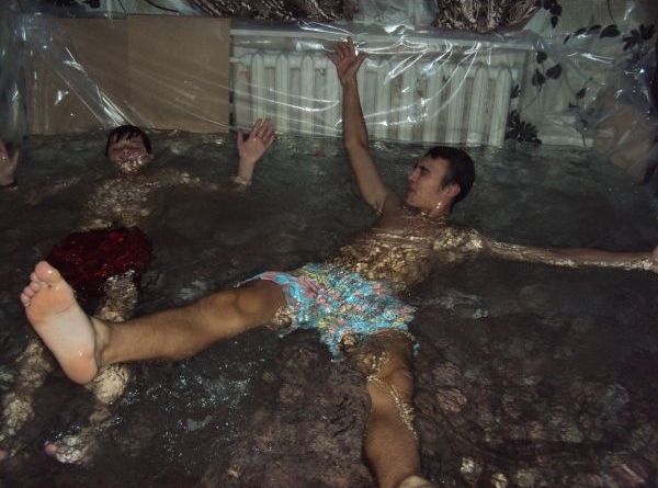 На фотографиях, которые молодые люди выложили в социальные сети, видно, что импровизированный водоем сделан с помощью нехитрых материалов - полиэтиленовой пленки, картона, скотча, брезента. Остается неясным, как и куда ребята собираются сливать воду и в курсе ли их "забав" собственник жилья.
