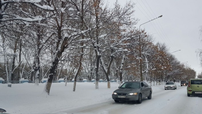 Снежная метель началась в городе вечером 9 ноября. Она бушевала всю ночь, затем ветер закончился, но снегопад продолжается до сих пор. Работы по расчистке затрудняет теплая погода: снег мокрый, плотный, тяжело убирается.