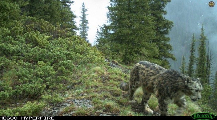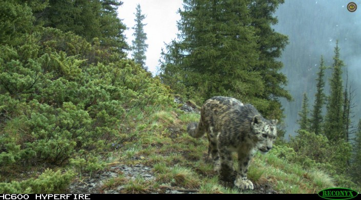 "В период проливных дождей в Алматинской области мокли не только жители города и близ лежащих поселков, но и снежные барсы высоко в горах. Мокрый барс прошел мимо фотоловушки, и выглядел крайне недовольным", - комментируют в КазГЕО.