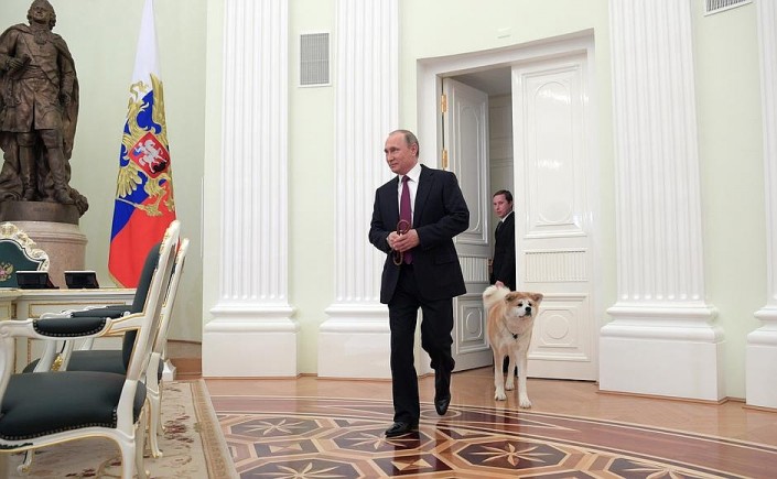 На встречу с журналистами президент России пришел с собакой породы акита-ину, которую Путину подарили в 2012 году власти японской префектуры Акита.