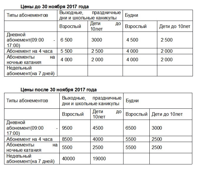 До 10 ноября действует специальное предложение: 25-процентная скидка на все сезонники. До 10 ноября купить сезонный абонемент возможно по цене 115 000 тенге (детский), 160 000 тенге (молодежный) и 220 000 тенге (взрослый). Добавим, что цены на абонементы без скидки составят 290 000 тенге (взрослый), 210 000 тенге (молодежный) и 150 000 тенге (детский).