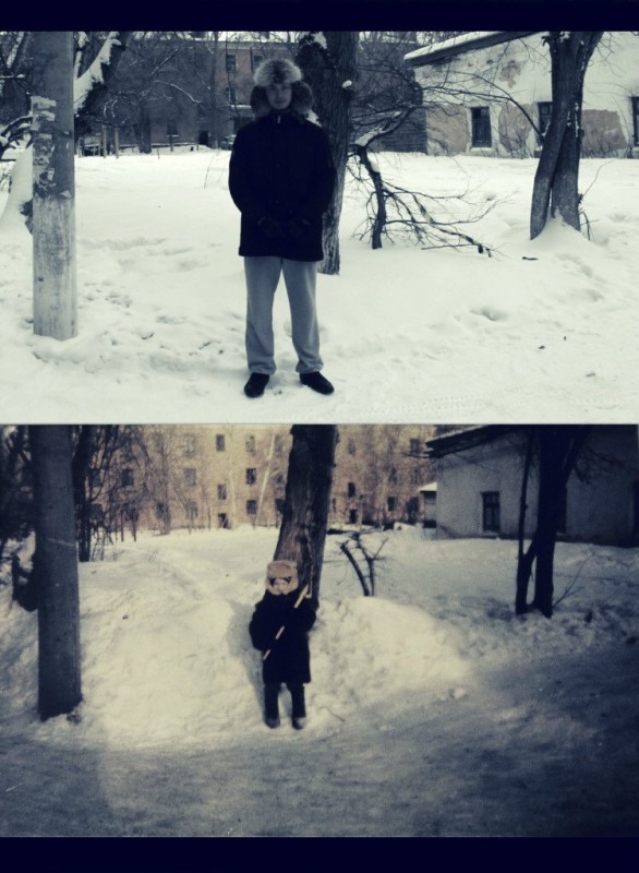 Кроме того, Станислав воспроизвел свое детское фото. Встал в точно такой же позе в своем дворе с лопатой и сфотографировался. Разница между фото - 17 лет.