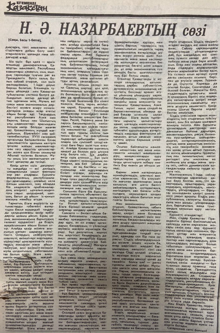 Кітапханадағы ескі басылымдарды қолымызға алған кезде көзімізге түскені - сол кездегі "Егеменді Қазақстан" газетіндегі Тұңғыш Президент - Елбасы Нұрсұлтан Назарбаевтың сөзі.