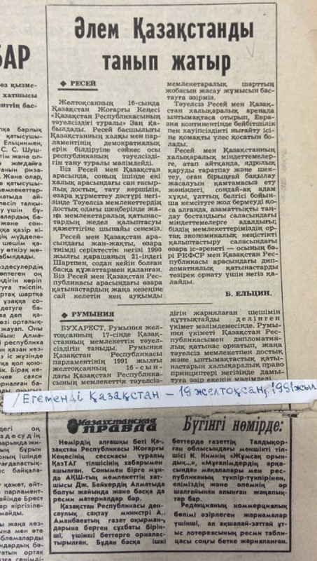 16 желтоқсанда Қазақстан Жоғарғы Кеңесі "Қазақстан Республикасының тәуелсіздігі туралы" Заң қабылдауына байланысты Ресей басшылығы республиканың тәуелсіздігін тануы туралы мәлімдеген. Сонымен қатар, 17 желтоқсанда Румыния еліміздің тәуелсіздігін танып, құттықтауын жеткізген екен.
