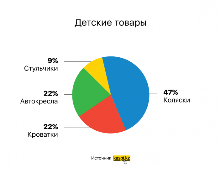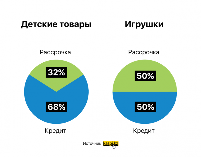 Например, в магазине на сайте Kaspi.kz категория "Детские товары" появилась всего несколько месяцев назад. Сейчас из всех клиентов, которые покупают коляски, кроватки и другие детские товары с помощью рассрочки или кредита Kaspi, уже около трети перешли в онлайн.