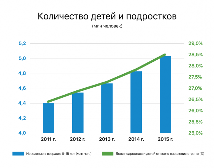 Сейчас дети занимают 28,4 процента в общей численности населения (в 2014 году - 27,8 процента). Для сравнения: в Германии – 13,3 процента, в России -15,2 процента, во Франции - 18,5 процента.