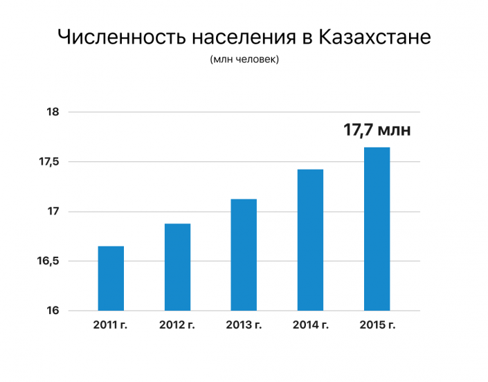 Население в Казахстане продолжает активно расти. Кризис последних лет не повлиял на темпы демографического роста, которые сохранились на уровне стабильных +1,5 процента в год. По итогам 2015 года число жителей страны достигло 17,7 миллиона человек.
