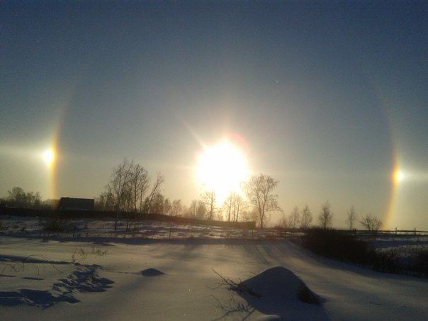 Сразу три солнца в небе - это редкое оптическое явление под названием "эффект Гало", которое можно наблюдать в морозную и ясную погоду. В это время в воздухе образуются небольшие ледяные шестигранные кристаллы, которые нельзя увидеть невооруженным взглядом. Сквозь них преломляются лучи солнца. В результате создаются оптические иллюзии.