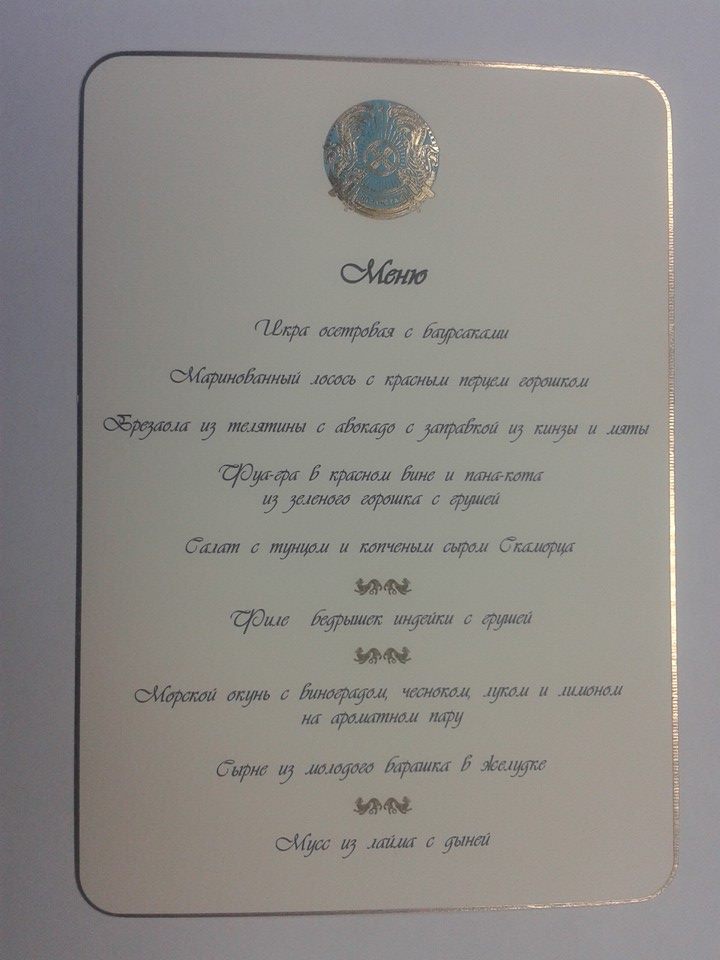 Недавно блогер Сырым Абдрахманов опубликовал на своей странице в Facebook одно из протокольных меню Главы государства. "Меню ужина Елбасы с его коллегами - мировыми главами государств. Даже не думайте копаться в Сети, это бесполезно - оно эксклюзивное", - написал он в пояснении к фото. Блогер отмечает, что каждое меню составляется с особой диетой глав государств и согласовывается с их протоколом.