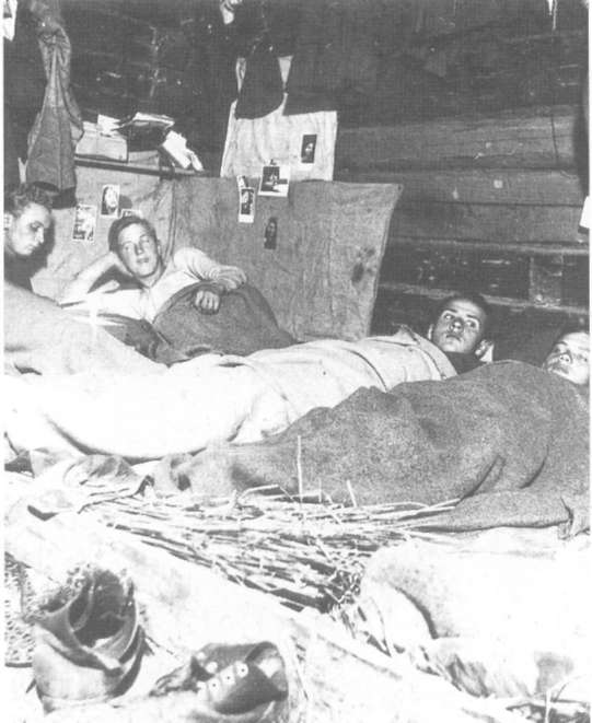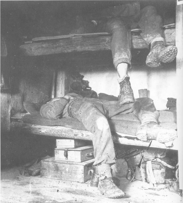 Из воспоминания бойца Ленинградского фронта 1025-й отдельной минометной роты Ивана Мельникова: "В апреле 1942 года приехали на место, сразу зарылись в землю, построили хороший блиндаж. Под землю ведет отверстие, потом ступеньки земляные, на дверях плащ-палатка, внутри проход, а по бокам нары, покрытые соломой. Немцы повсеместно пользовались шерстяными одеялами, советские же солдаты обходились шинелью, она была с нами практически все время - зимой на плечах, летом в скатке. В ходе наступления, когда наши войска выбивали врага из укреплений, они имели возможность познакомиться с его бытовыми условиями. Блиндажи у немцев были добротные, стенки выкладывали березой, на нары стелили солому, внутри всегда было тепло. Но теплые немецкие укрепления просто кишели паразитами. Все солдаты ощущали наличие этих ужасных паразитов. Бывало, идет солдат по лесу, видит спиленный поровнее пень, снимет шинель и давай о пень колотить, так шинель вся и покраснеет. До того их было много". Распространению вшивости способствовало и то, что бойцы часто пользовались чужой одеждой и постельными принадлежностями, в том числе принадлежащими местному населению.