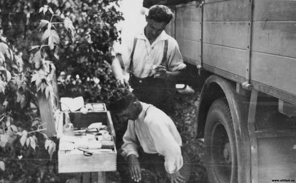 Западный фронт. Стрижка и бритье советских бойцов в прифронтовой парикмахерской. Август 1943 год.