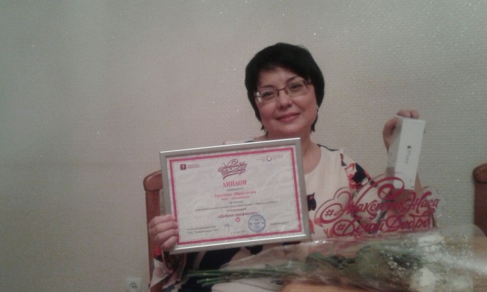 Гульмира Абдрашева - основатель клуба добряков Астаны. Сегодня на попечении у клуба 67 столичных семей, это проверенные семьи, для которых такой клуб - возможность выжить в это непростое время. Клуб проводит аукционы, все полученные от аукциона средства уходят на помощь нуждающимся. Один из общеизвестных лотов - это перчатки Геннадия Головкина с личным автографом именитого боксера. В номинации "Добро в интернете" Гульмира оказалась безоговорочным победителем, набрав 48,5 процента голосов. В подарок за победу в своей номинации Гульмира получила ноутбук.