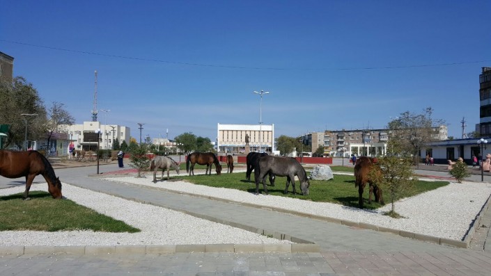 В Сатпаеве лошади паслись на новом газоне перед акиматом