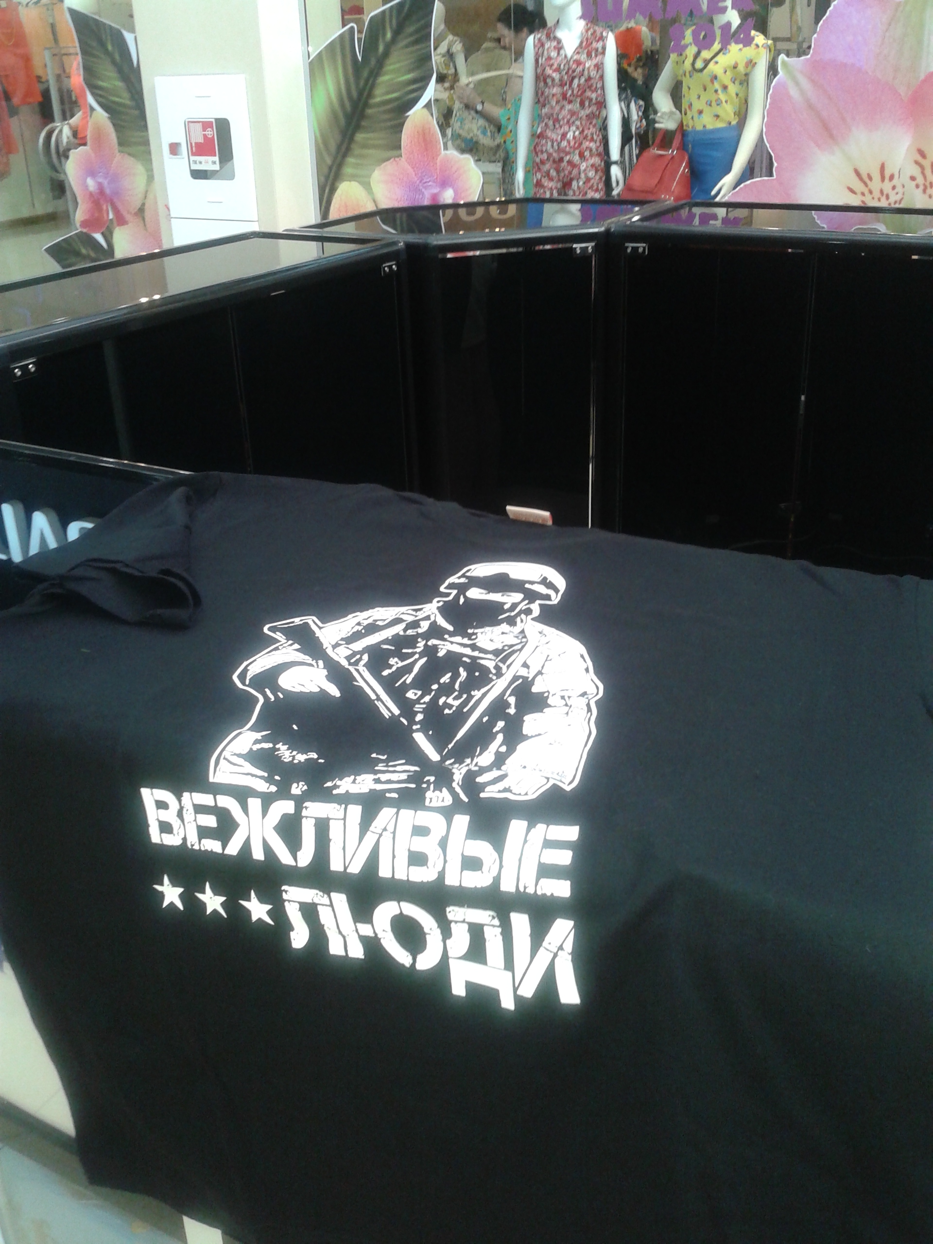 Казахстанцы приобретают футболки с изображениями "вежливых людей". Об этом корреспонденту Tengrinews.kz сообщила предприниматель из Алматы Надежда Захарова. "Вежливые люди" - это шуточный термин, который обозначает солдат в форме без опознавательных знаков, появившихся в Крыму в начале 2014 года. Так наблюдатели описывали поведение неизвестных военных, которые брали под контроль объекты различного назначения, включая и воинские части.