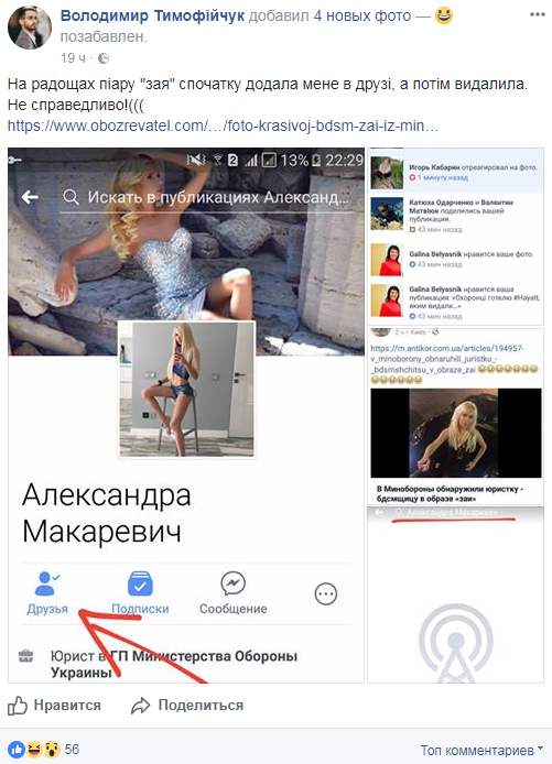 В личном профиле Макаревич указано, что она работает юристом. "Интересные юристы в Минобороны", - подписал скриншоты фотографий девушки журналист. На одном из снимков Макаревич запечатлена в нижнем белье и кожаной маске с заячьими ушами, поэтому пользователи прозвали ее "красивой заей". Комментаторы выстроились в очередь, чтобы записаться к юристу "на прием".