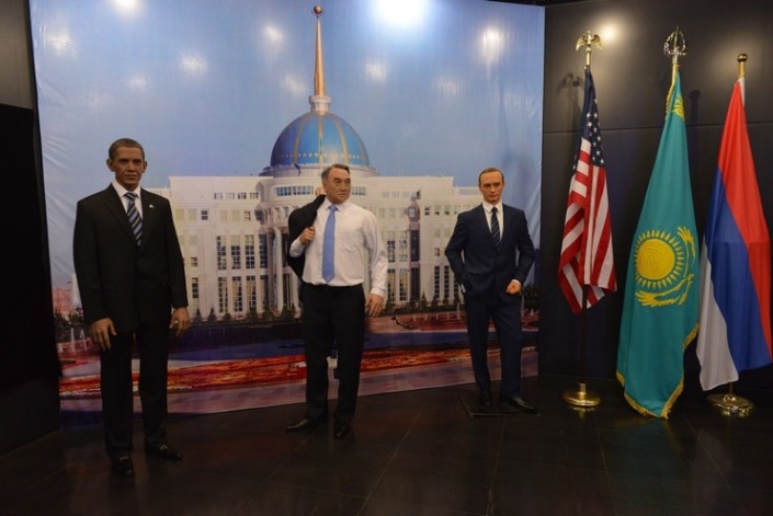 Кроме того, здесь же можно увидеть три работы казахстанского художника, скульптора Айдоса Есмагамбетова. Он создал фигуры Нурсултана Назарбаева, Барака Обамы и Абылай-хана.