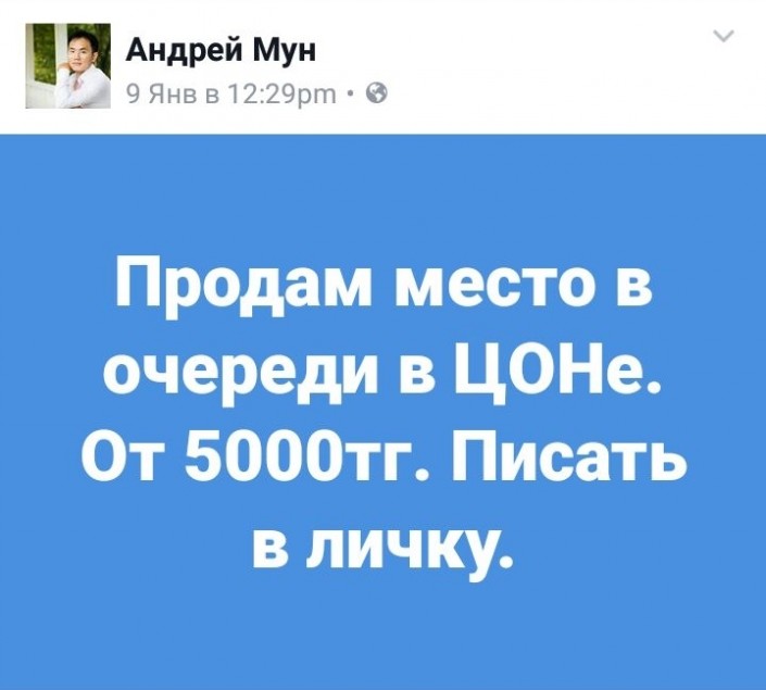 В ЦОНах Алматы и Астаны с связи с последними изменениями в законе наблюдается наплыв посетителей. Поэтому некоторые пользователи Казнета в шутку предлагают "купить" место в очереди за символическую плату.
