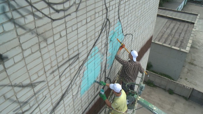 "Когда рисуешь, к примеру, на высоте 9-го этажа, это совсем не то, что с баллончика раскрашивать забор, рассказал Айбек Нурбеков. Сейчас уже нормально работаю, а сначала было не очень приятно вниз смотреть, руки тряслись, а теперь привык".
