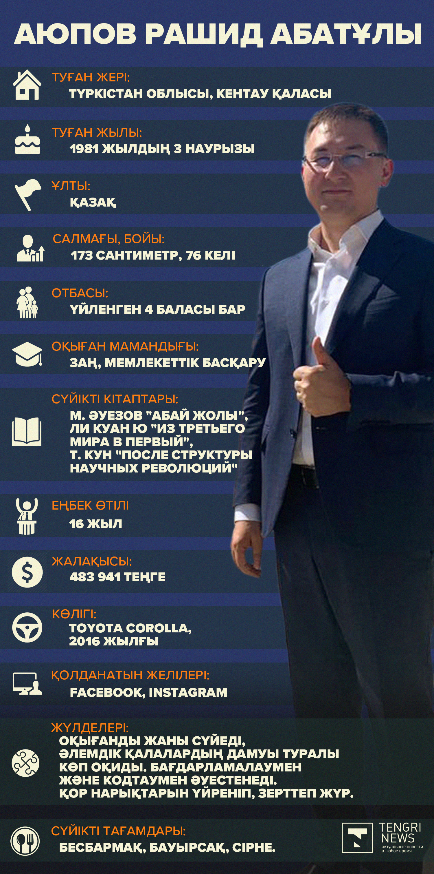 3 шілдеде Түркістан қаласының әкімі қызметіне Рашид Аюпов тағайындалған болатын. 38 жастағы шенеуніктің мемлекеттік қызметтегі өтілі 15 жылдан асқан. Тengrinews.kz тілшісі Түркістан қаласының әкімі туралы мәліметтер ұсынады.