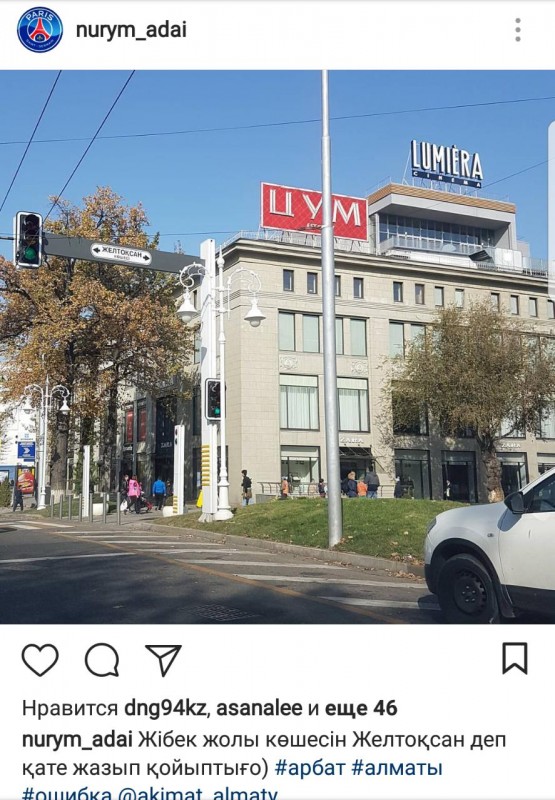 Желтоксан или Жибек Жолы? Дорожный указатель возле ЦУМа вызвал недоумение у алматинцев фото Nurym Adai/Instagram