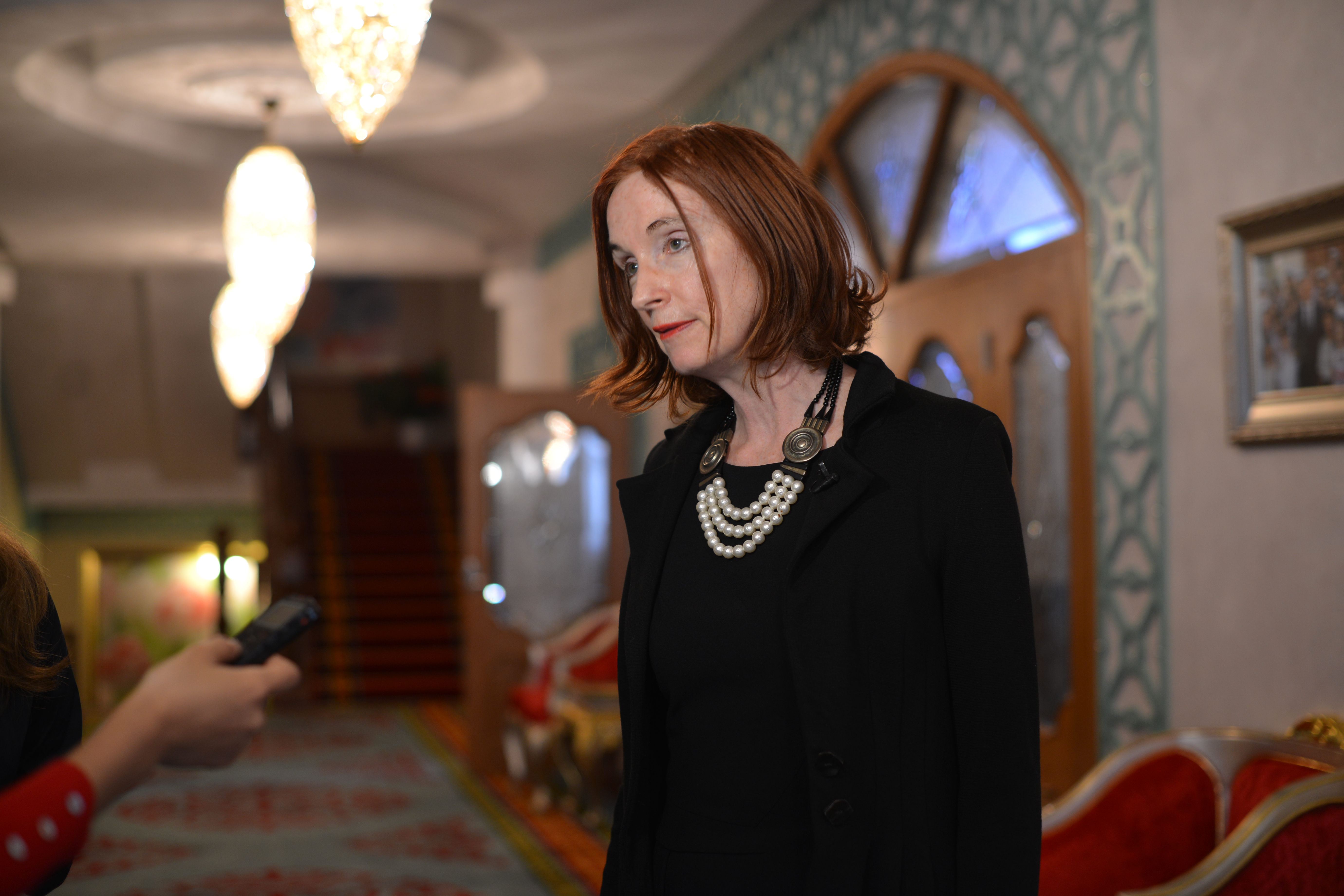 Представительницам дипмиссий провели экскурсию по институту и рассказали о том, чем здесь будут заниматься его воспитанницы. В кабинете прикладного мастерства супруга представителя посольства США Элоиса Клечески примерила национальный головной убор.