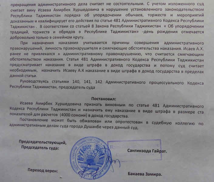 Однако судья сочла такой рассказ неубедительным и оштрафовала именинника на 4 тысячи сомони (160 тысяч тенге).