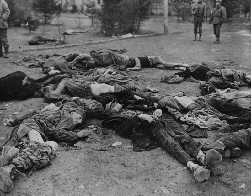 Тела узников концентрационного лагеря Бухенвальд. Бухенвальд - один из крупнейших концентрационных лагерей на территории Германии, располагавшийся близ Веймара в Тюрингии. С июля 1937 по апрель 1945 года в лагере было заключено около 250 тысяч человек. Количество жертв лагеря оценивается примерно в 56 тысяч узников.
