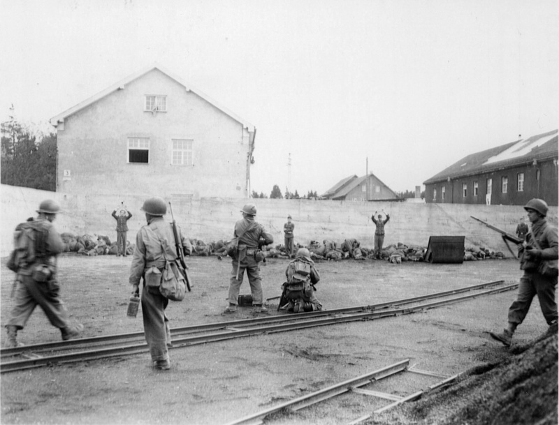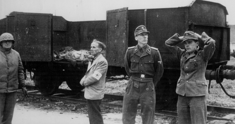 Сдавшийся унтерштурмфюрер СС Генрих Викер (Heinrich Wicker, позже расстрелян американскими солдатами) у вагона с телами узников концлагеря Дахау. На фото второй слева - представитель Красного Креста Виктор Майрер.