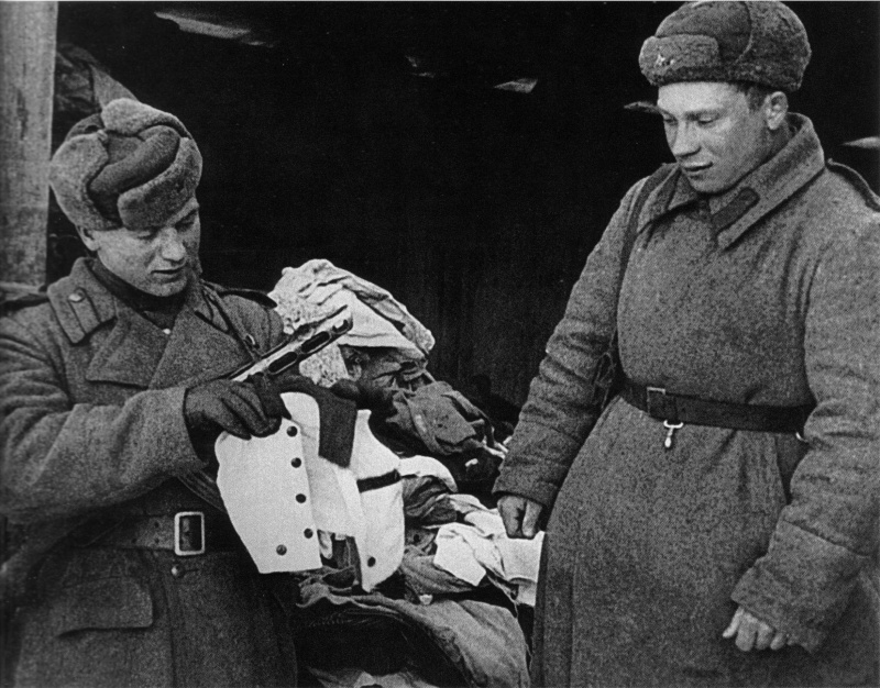 Советские солдаты рассматривают детскую одежду, найденную в концлагере Освенцим.