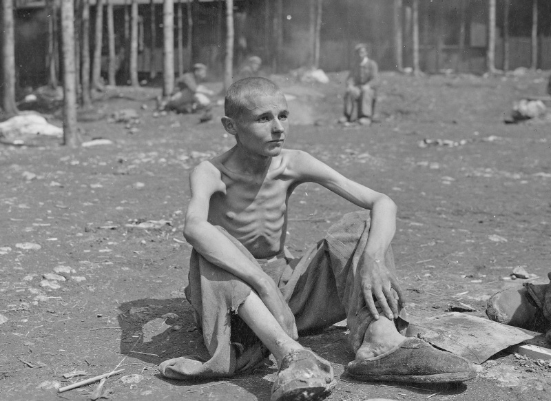 Один из истощенных заключенных лагеря в Эбензее греется на солнце. Концлагерь Эбензее находился в 40 километрах от Зальцбурга (Австрия). Лагерь существовал с ноября 1943 по 6 мая 1945 года. За 18 месяцев через него прошли тысячи узников, многие из которых здесь погибли. Известны имена 7113 погибших в условиях бесчеловечного содержания. Общее же число жертв составляет более 8200 человек.