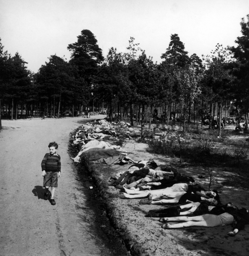 Немецкий мальчик идет по грунтовой дороге, на обочине которой лежат трупы сотен заключенных, которые умерли в концлагере Берген-Бельзен в Германии.
