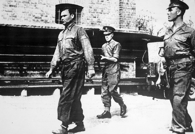 Арестованный комендант концлагеря Берген-Бельзен Йозеф Крамер (Joseph Kramer) в кандалах и под охраной английского конвойного. Прозванный "бельзенским зверем", Крамер был осужден английским судом за военные преступления и в декабре 1945 года повешен в тюрьме города Хамельна.