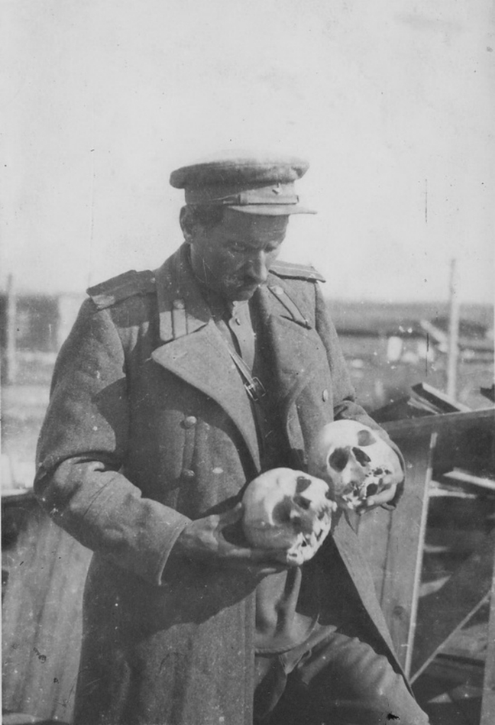 Лейтенант А.А. Гуйвик держит в руках останки узников концлагеря Майданек.