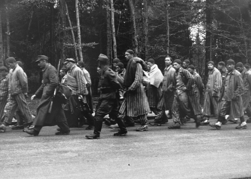 Колонна узников концлагеря Дахау на марше в пригороде Мюнхена.
